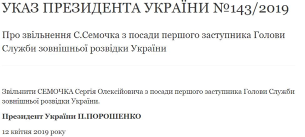 Указ об увольнении заместителя руководителя Службы внешней разведки Украины Сергея Семочко появился на сайте президента.